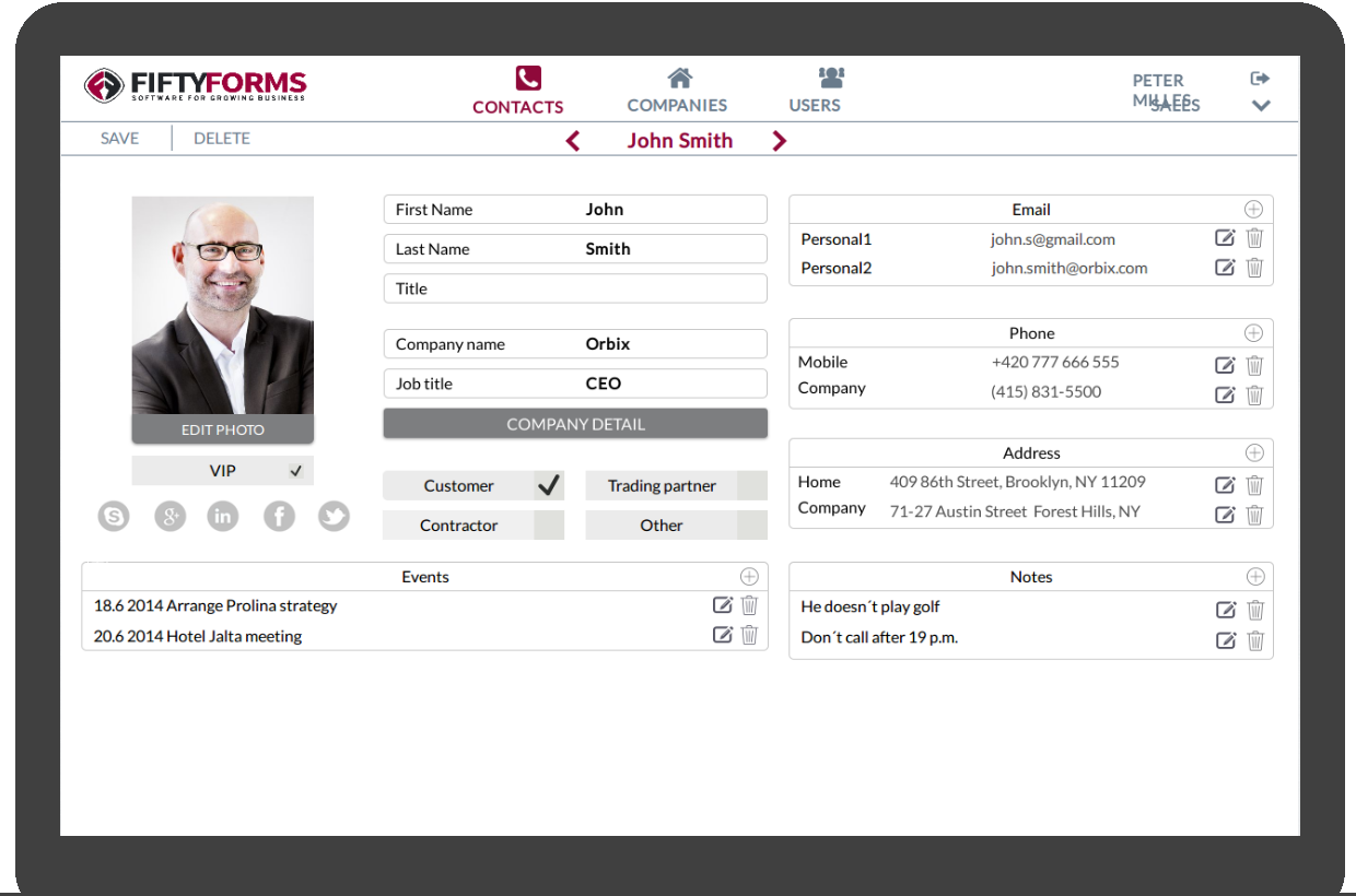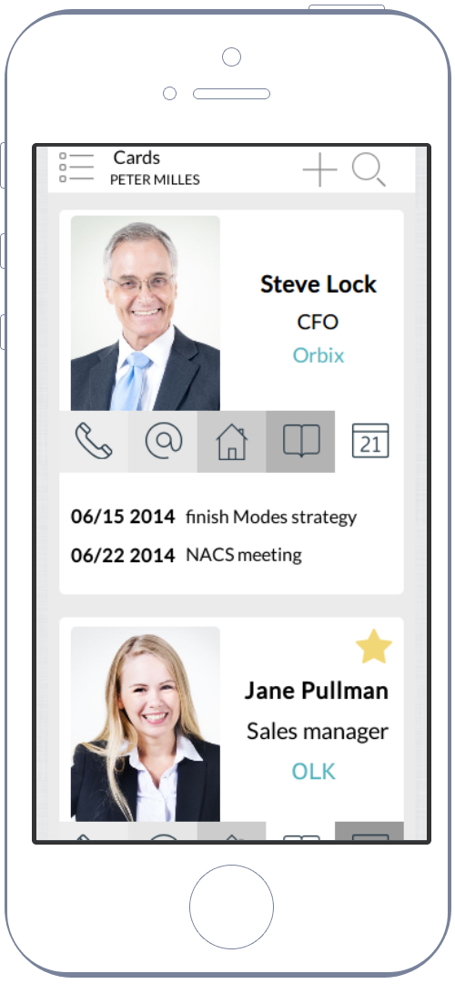 Contact4M allows you to store your customer data to customer cards. All contacts, notes and history are always available on-line. Your employees can create customer cards any time from their smart phones.